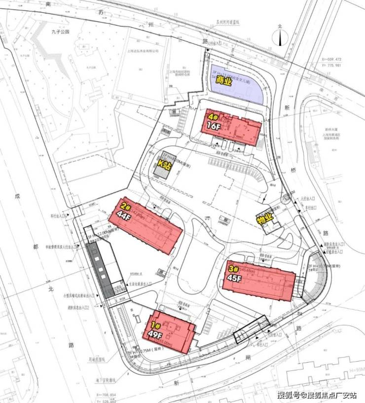 1#地块由四幢住宅组成,其中1幢住宅建筑高度能到165米,将超过浦西顶豪海泰北外滩和150米高的华侨城苏河湾双子塔。更是高于153米高的陆家嘴汤臣一品。其余2#和3#分别在142-145米左右,44-45层楼。4#则是16层高的住宅。