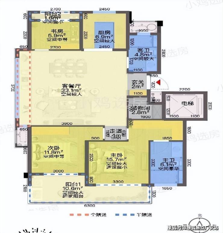 优势:全明卫、2个阳台、客餐厅较大、有玄关、大飘窗、U型厨房,阳台宽约6.3米、双阳台。