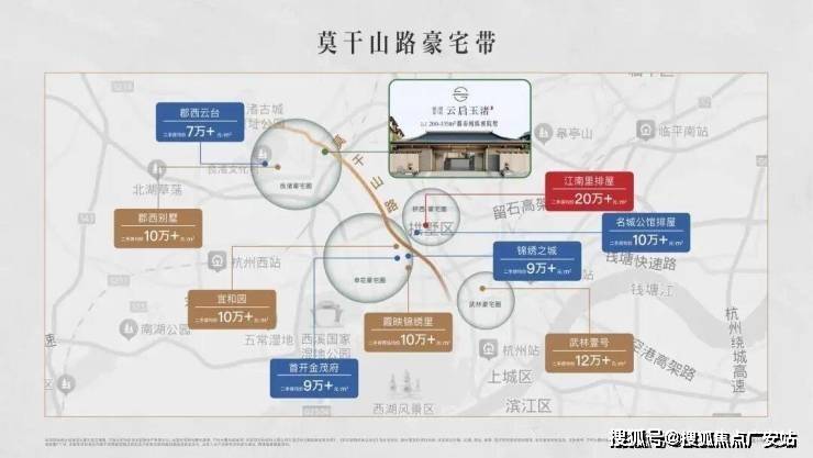 首先是位置,云启玉渚位于杭州最主要的莫干山路豪宅带,所谓「一条莫干山路,半部杭州豪宅史」,串联起了良渚-申花-桥西-武林四大豪宅圈,囊括了江南里、宜和园、武林壹号等杭州顶级豪宅。