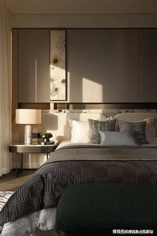 浅色系的床品与空间极致融合,木饰面搭配雪山兰奢石以深浅的明暗色调平衡臥房內的溫度,形成奢适与静雅的平衡,赋予空间深沉内敛的韵味,不失奢华。