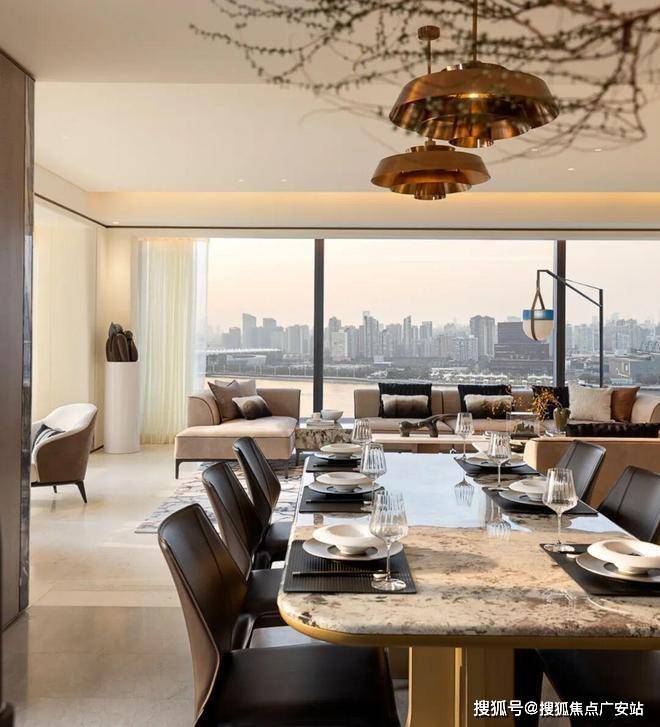 理石肌理与白色调交织相融,构筑起通透基底,焦糖色家具自带温和诗意,与窗外城市景致遥相呼应,共同勾勒出生活的丰盈画卷。