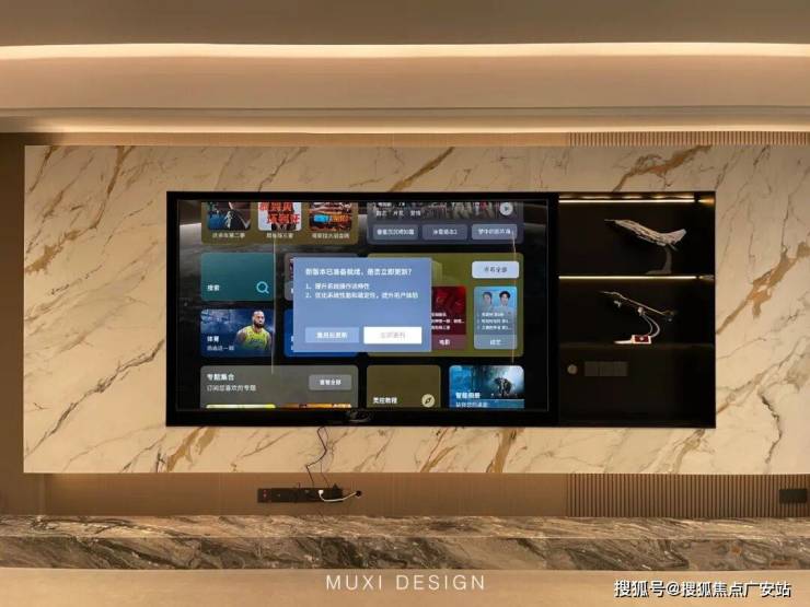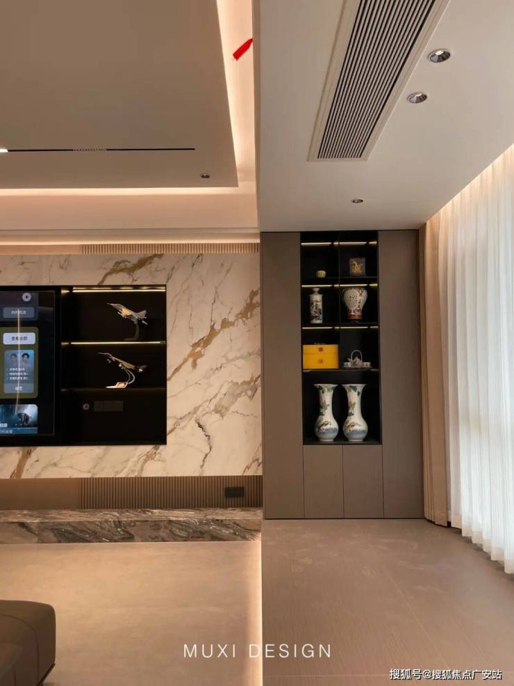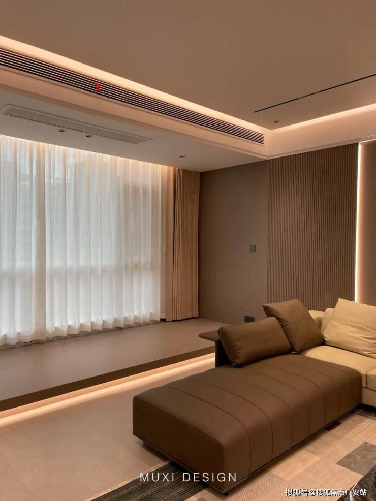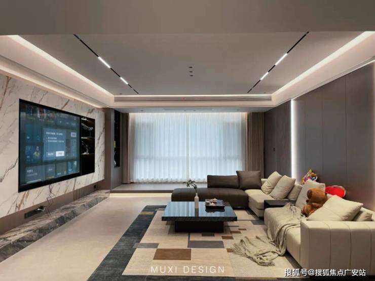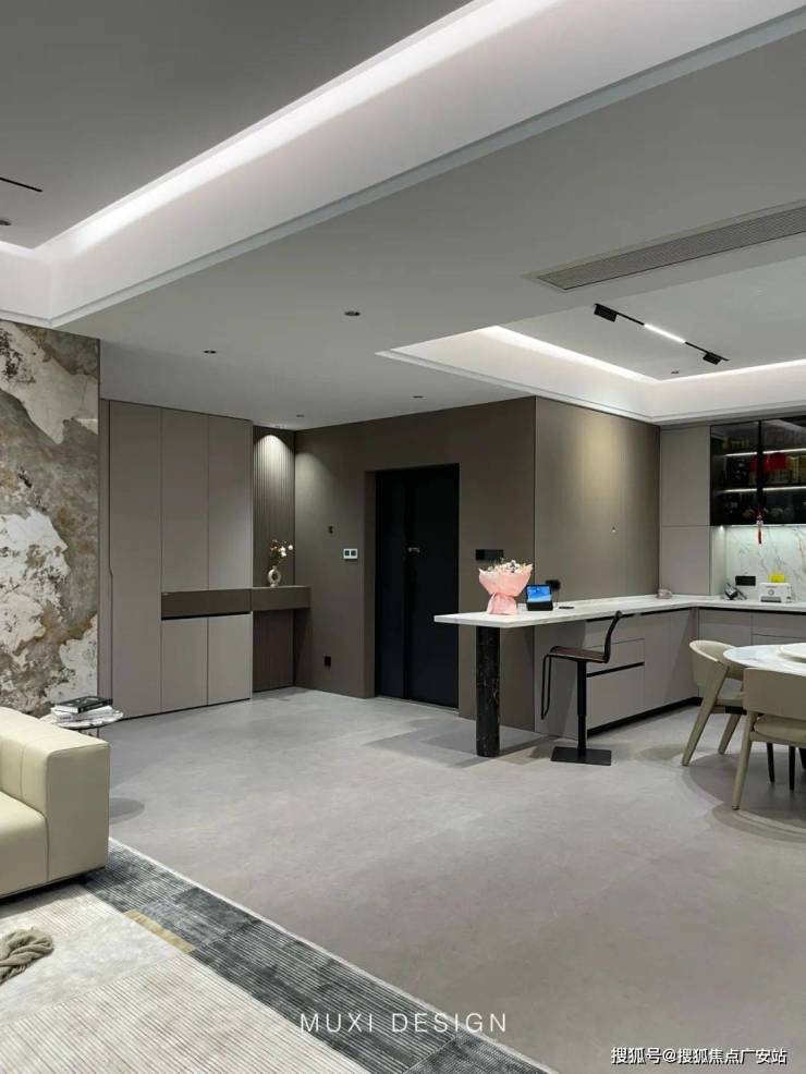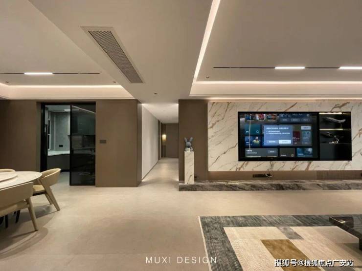 客厅背景选用栅格栏和岩板的组合,中间加入两条灯带动感十足,岩板的花色随性又优雅,与全屋调性一致,黑棕配色的真皮沙发堪称经典。