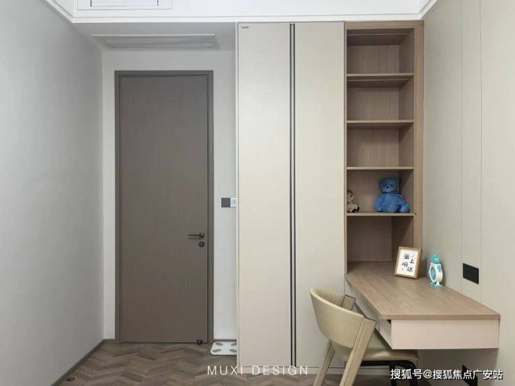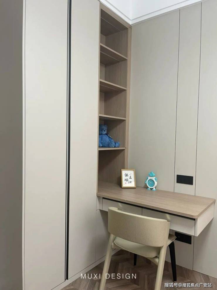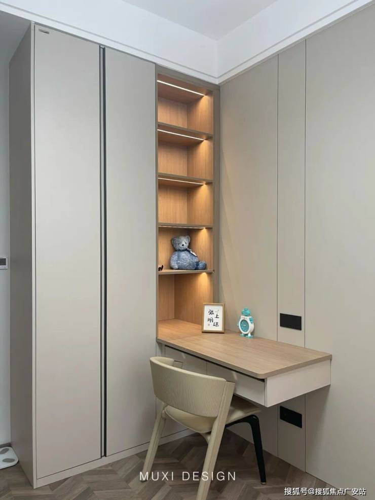 一门到顶实木衣柜,奶油白的颜色温和亮眼,衣柜衍生出书桌,柜板下面安装了灯带,亮灯时也很有安全感。