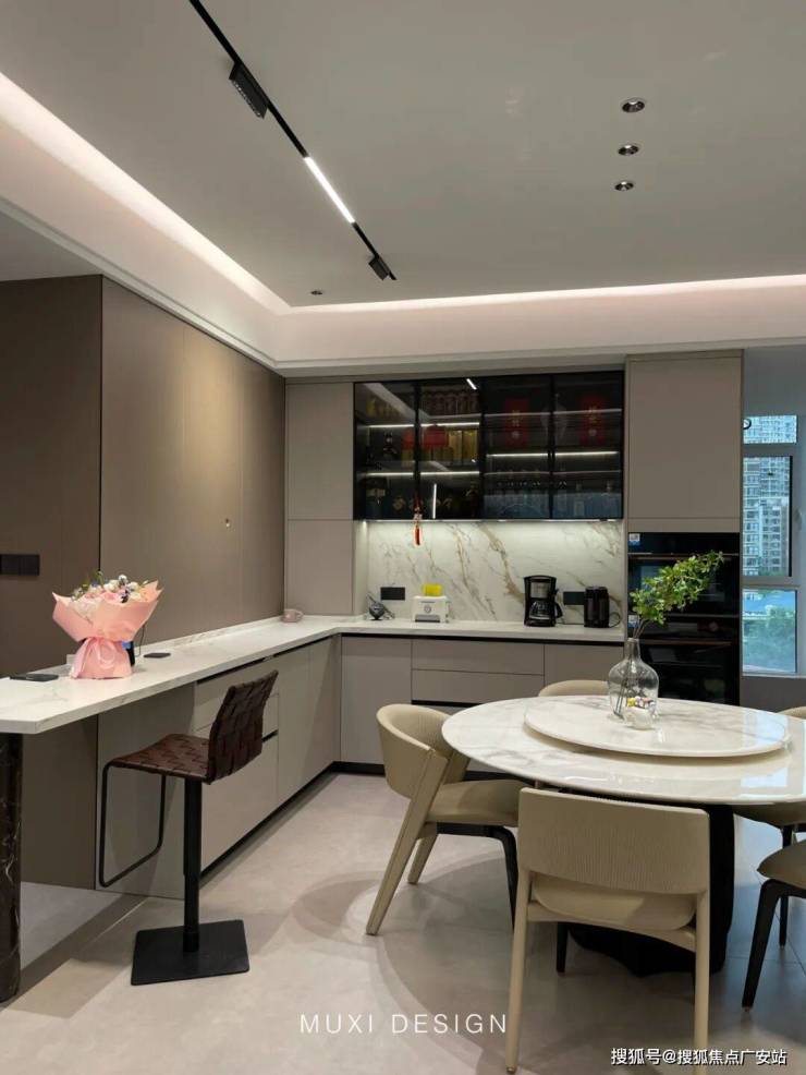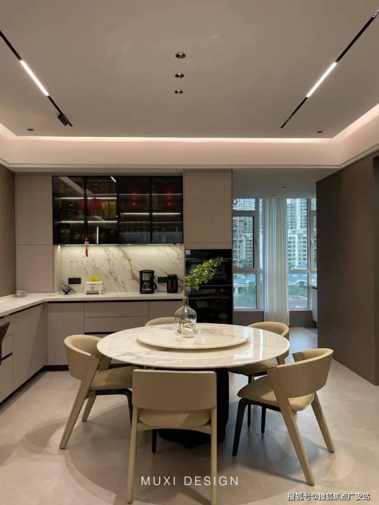 玄关连接餐厅的地方做岛台设计,和餐边柜一起形成一个L型既隔开了空间也方便拿取东西,在这里喝个小酒也是非常惬意的。圆形的双层岩板餐桌,可以随意转动,围成一个温馨的餐厅氛围。
