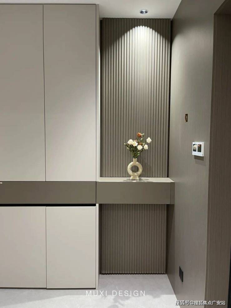 一进门就能看见顶天立地玄关柜,中间做了处理,白色柜子插入一道棕色隔板,让玄关整体不那么呆板。