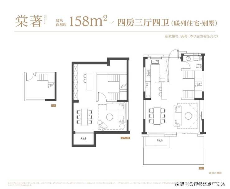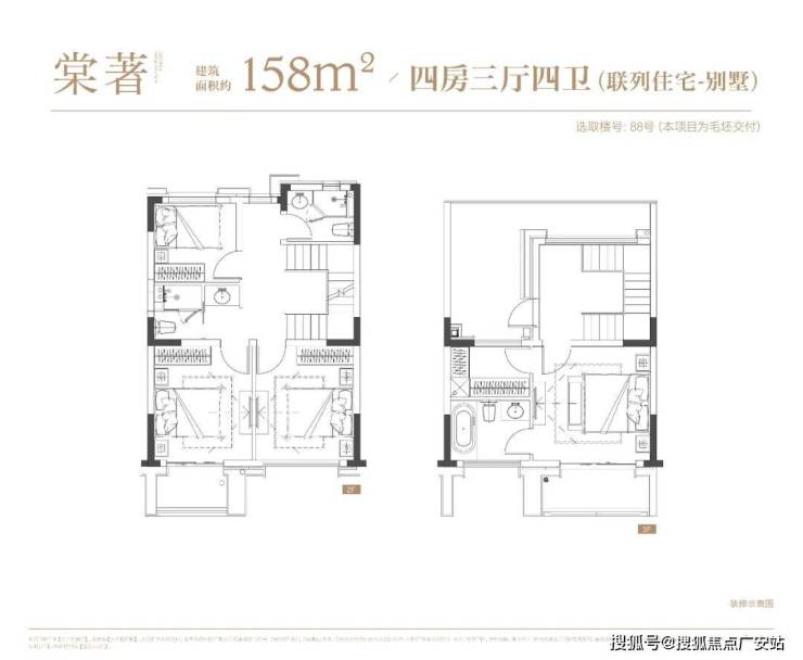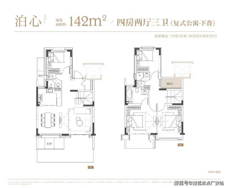 4层叠墅分为上/下叠,上叠建筑面积约139㎡,下叠建筑面积约142㎡,均为4房设计。