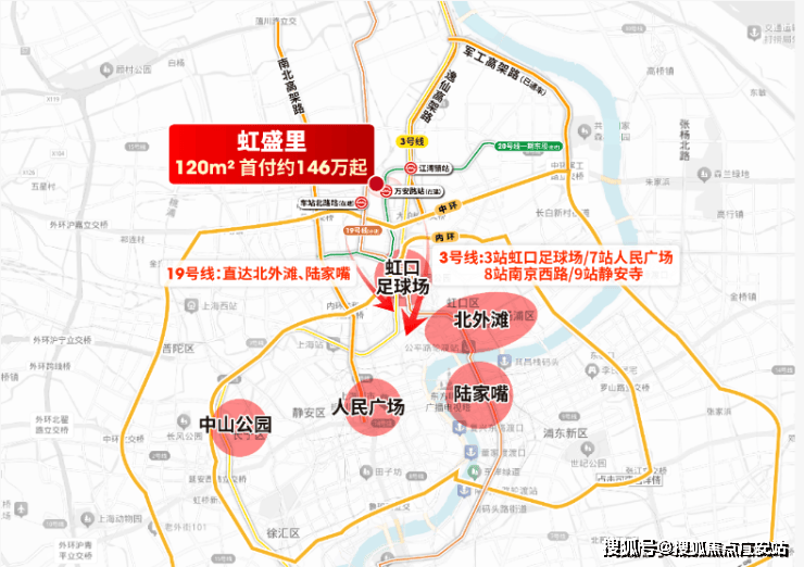 2.中环核心+三轨交汇:直线距离人民广场仅约7.5公里,咫尺中环,直线距离内环仅约1.8公里;三轨交环绕——直线距离3号线江湾镇站约500米,3站虹口足球场/7站人民广场,20号线万安路站约150米(在建)、19号线车站南路站约900米(在建);内环、中环、逸仙高架路交汇,通达性在同级项目中无出其右。