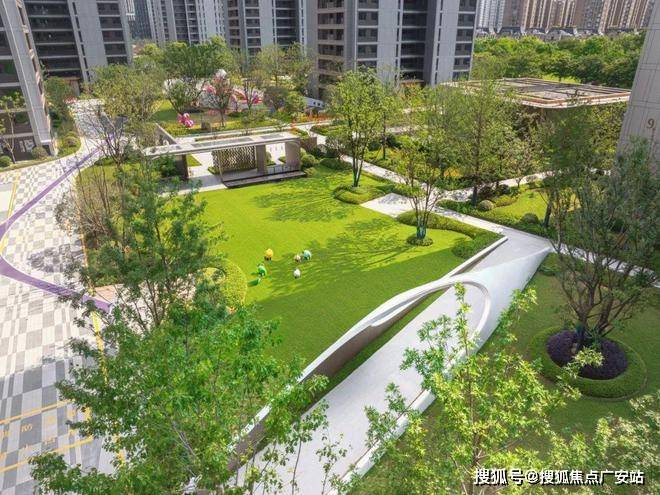 流光星桥:景观廊桥串联互动场域,疏松的林荫下觅得一处视野宽敞开阔的会客厅+阳光草坪的组合空间,成为社区交往的引力核心。