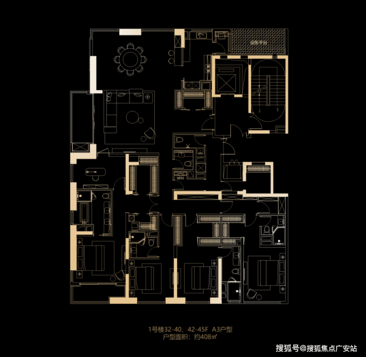 顶豪社交空间格局,普遍只有餐厅、客厅和阳台,该户型在南侧配置了一个家庭厅着实巧妙,可以是业主的茶室,也可以是女主人的手工室,当然也可作为X空间,随家庭结构和需求随心定制,书房、学习区、游戏区,女王化妆间等皆可。