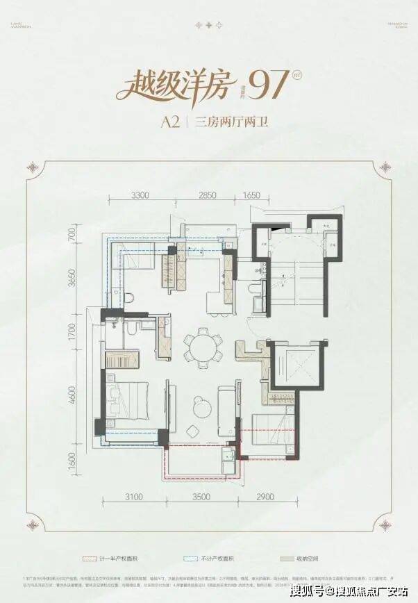 约97㎡「越级洋房」三室两厅两卫,以约86-90%的高实得率,采用零走道飞机户型设计,相当于常规市面产品的109m2产品,实现全明正三房的舒适体验。