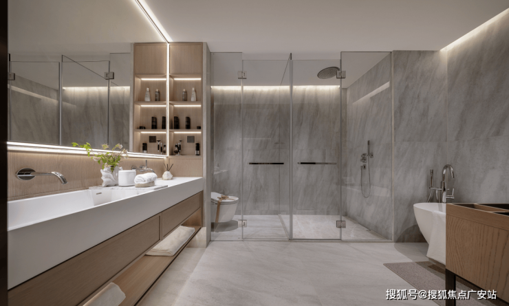 选材上也是相当精细!严选成本高昂的大规格进口瓷砖,减少墙面拼缝,呈现顶级星级酒店卫浴的整体感,达到目前样板间的高阶精装效果~