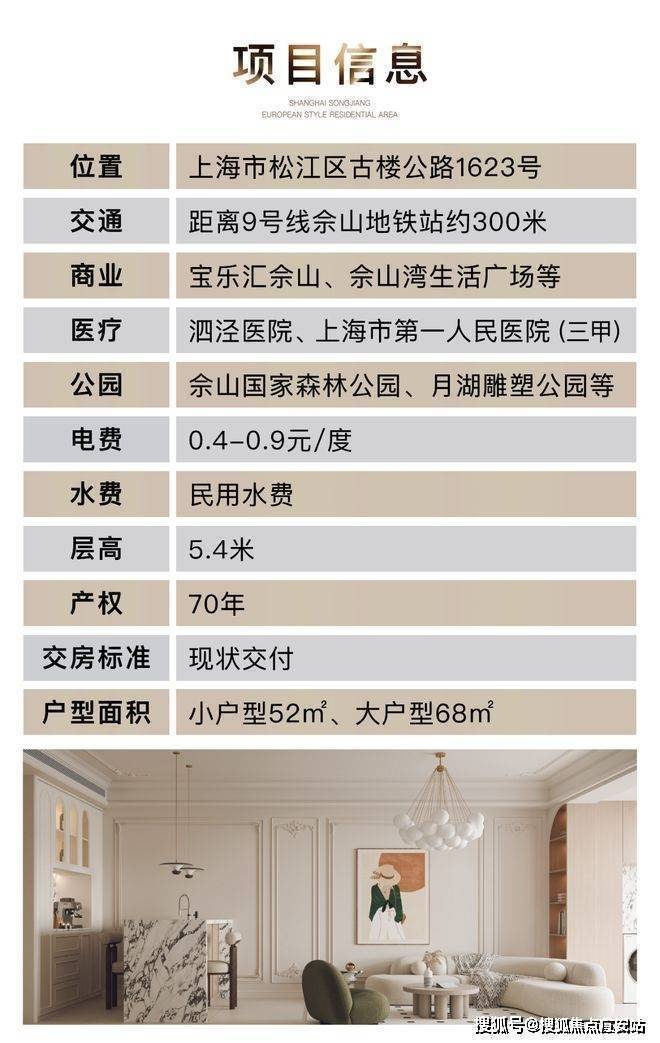 户型面积:小户型52m、大户型68m,电费:0.4-0.9元/度,水费;民用水费,层高:5.4米,产权:70年,9号线佘山地铁站约300米。