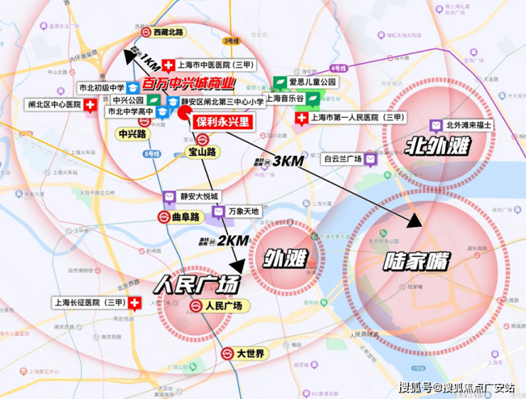 区域配置上,直线距离3公里内涵盖南京西路、人民广场、外滩、外白渡桥等顶级商圈与地标,尽享城市繁华。周边交通便捷,距8号线中兴路站约450米,3/4号线宝山路站约400米,三轨环绕,通勤极为便利。1公里内汇聚华润苏河湾中心、中粮大悦中心、万象天地等高端商业,同时坐拥约17.5万㎡城市公园绿地(规划中)、苏河湾公园体系、中兴公园等生态资源,居住环境舒适宜居。医疗资源丰富,3公里内有上海市中医医院、上海长征医院、上海市第一人民医院、上海第十人民医院等多家三甲医院,全方位满足生活需求。