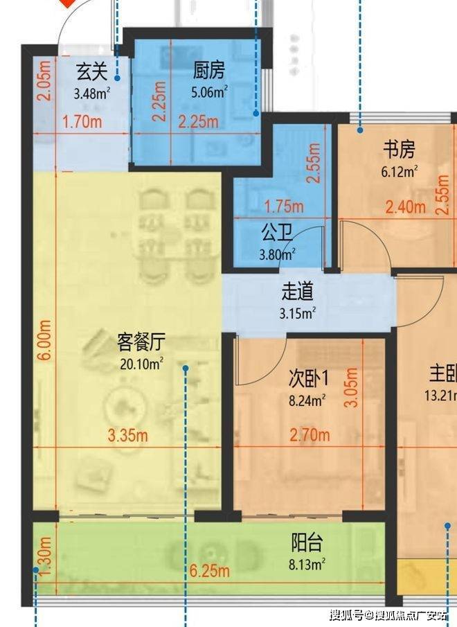首先,这套建面约106㎡户型,首推创变空间,整个户型南向面宽达到了惊人的约11.7米。