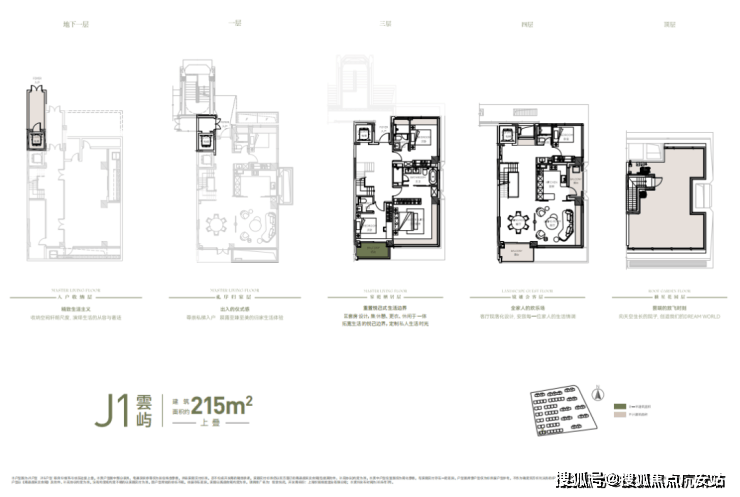 建面约215㎡上叠:屋面+庭院+地下室+露台+阳台的整体附赠空间约110㎡;