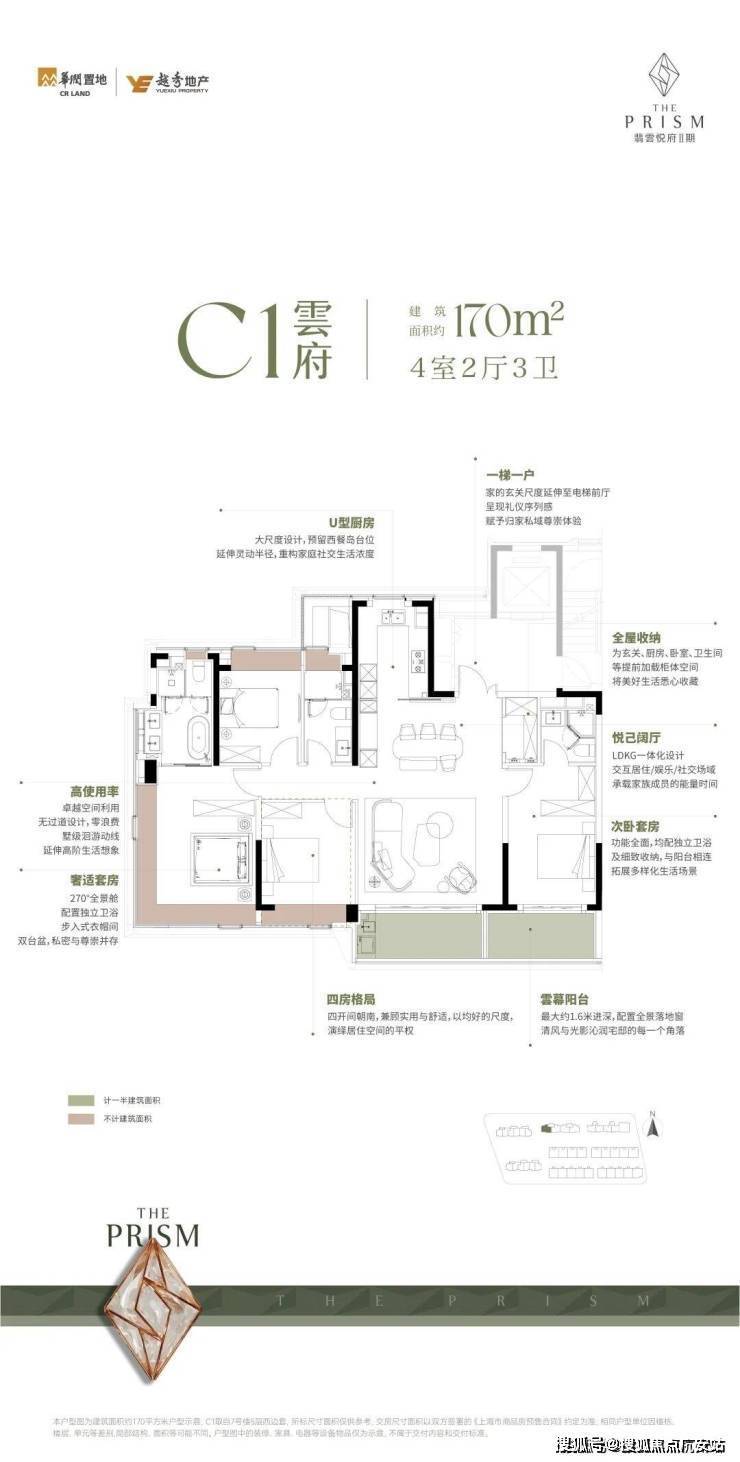 建面约170㎡产品,与市面上一般的4房产品而言,有着几点巨大的优势: