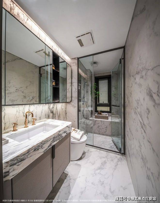 卫生间墙面采用大面积岩板,台盆柜处 定制镀金龙头 ;另外超大镜面柜内配置了充电口,方便剃须刀、电动牙刷等工具收纳。招商臻境售楼处电话:400_998_7894☎️☎️✅✅✅(全程购房服务)