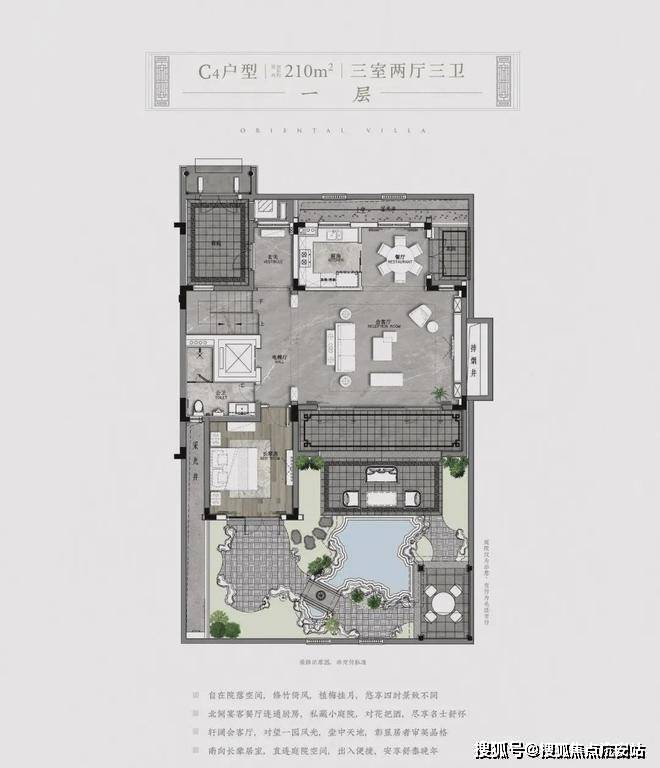 在建筑空间设计上,富春御园实现了传统院墅的现代革新。项目采用两层地面+地下室的创新布局,以170-320㎡的灵动尺度,打造出户户带庭院的中式合院。建面约320㎡的隐世合院以江南古镇为原型,约一亩地的家庭院落内亭轩错落、假山流水,目之所及尺度奢阔;而210㎡舒居合院则以约12m的南向开间,升级了人居体验感。这种既保留东方隐逸情怀,又融入西方享乐主义的设计哲学,使富春御园成为当代名仕的"第一居所"