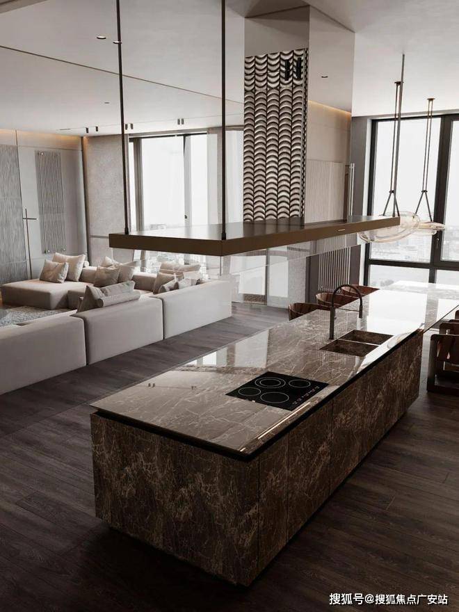 西厨吧台更是匹配了符合空间调性的东方木纹与龙飞凤舞石材,独特的纹理和质感提升了厨房品质与艺术性。