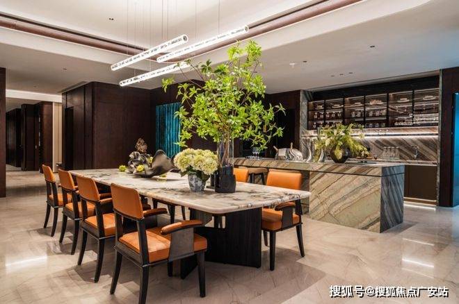 整个餐厅的墙壁和天花板全部使用可视镜作为装饰,把客厅和餐厅的风景全部融合在一起,餐厅的餐桌和大理石岛台完全烘托出现代的氛围感。