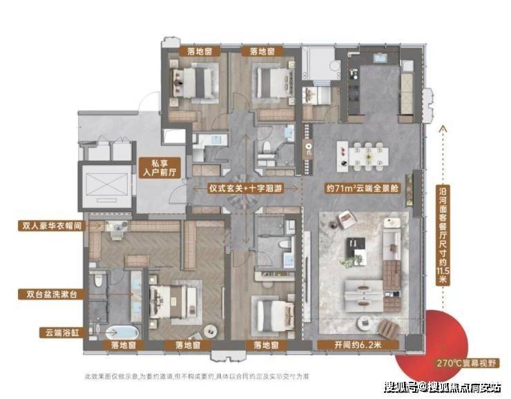 近50㎡豪华主卧套房,开间约7.2米,巨幅落地窗俯揽央景。抬头清晨的第一缕阳光、夜晚的璀璨星空,都能居家拥揽。