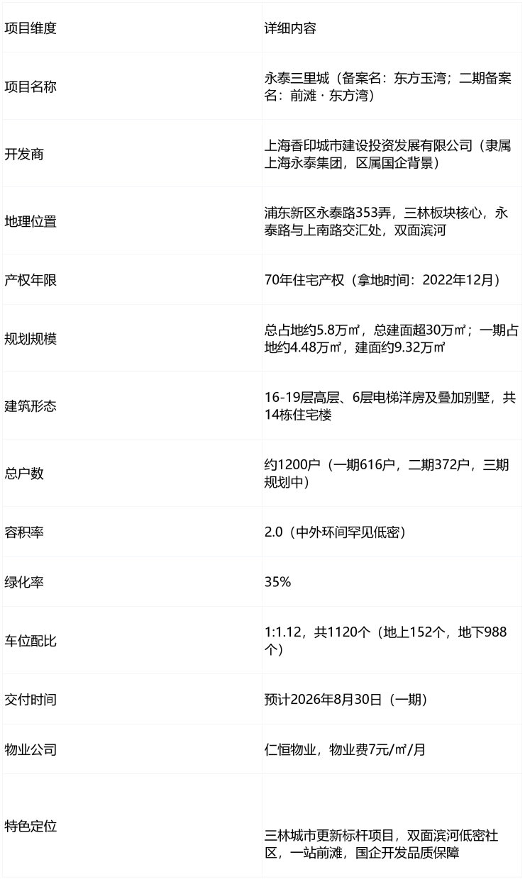 永泰三里城作为浦东三林金色中环带+前滩辐射区的30万方河滨低密大盘,由永泰地产开发、仁恒物业加持,核心优势可归纳为六大维度,完美平衡前滩红利与成熟生活,是浦东改善市场的热门之选。