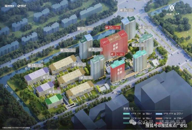 高层4大户型186、217、238、241方,其中186方是主力户型,占到一半以上,层高3.15米-3.3米,两梯两户,高端改善