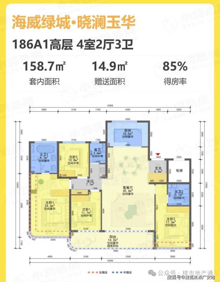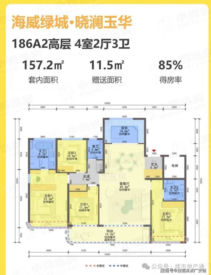 1)186方南厅户型,4房2厅3卫,得房率85-86%