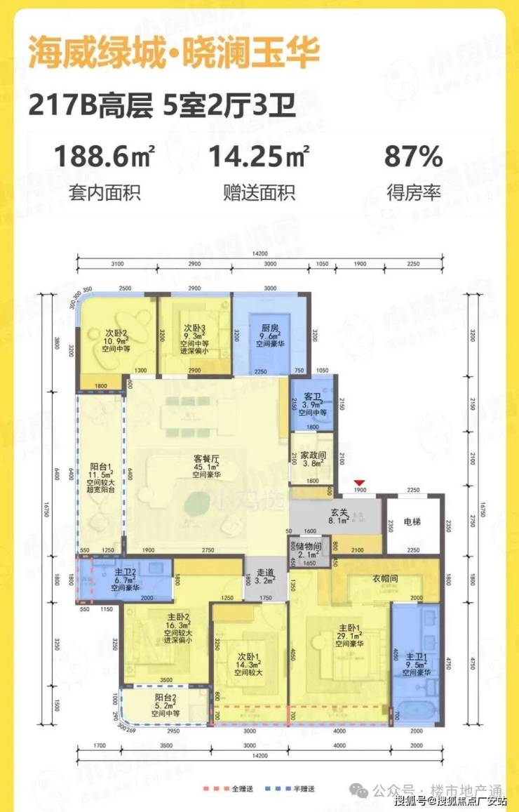 优点:入户超大玄关,独立家政间+储藏室,3房朝南+主卫也朝南,2房朝北,双阳台设计,三卫全明好评