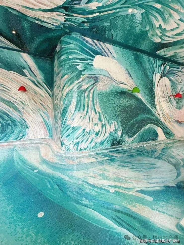 其中恒温泳池有个很大的亮点,打造了一个0.6米异形浅水池,非常适合小朋友玩耍。整面墙体采用马赛克拼贴,算是创新之作,之前几乎没有看到过,点赞