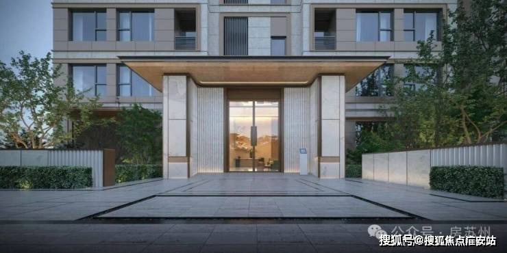 建筑立面选用米白与暖灰的现代轻奢色系,局部铝板线条+涂料一体板+石材及涂料组合使用,简约线条设计,彰显现代典雅美学风格。