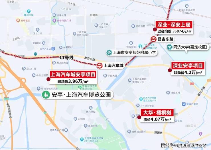 同样处于嘉定区,仅两站之隔的深业·深安上居的过会均价35874元/m²,相较于前者低了近1.5万/m²。