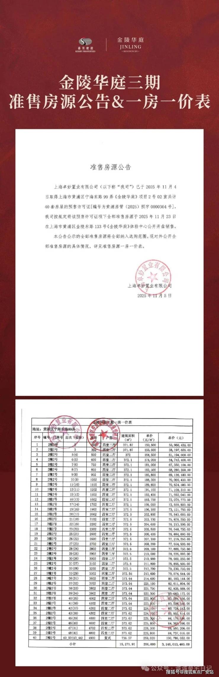 最新信息:黄浦区外滩街道核心豪宅项目【金陵华庭二期】最后批次加推,建面约370-730㎡大平层&复式,均价20.6万过会,2025年11月6日开启认购!
