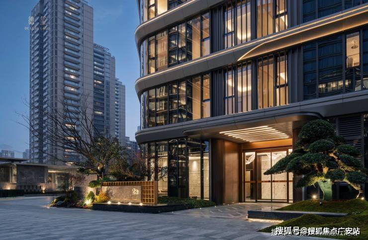 围合式布局打造“微度假隐逸之境”,入口罗汉松、巴西天宝石石材景观墙对标观云钱塘城