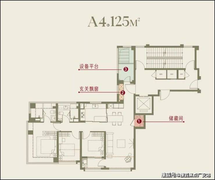 南向面宽达13.4m,四开间朝南,全卧超南。实得率超95%,多了20平空间,三阳台,满飘窗,设备平台,主卧室270°套间设计。层高3.15米。这个户型对比样板房,储藏间更大了,玄关收纳空间更大,收纳空间更多