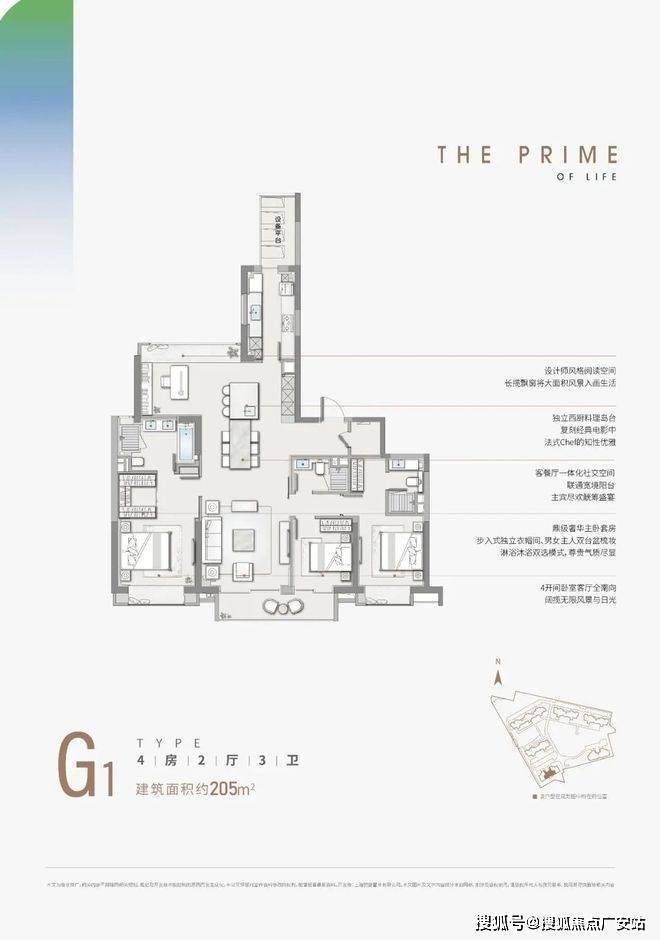 G户型:9号楼的中间套,本次开的最大户型205平。四开间朝南一字排开非常的霸气,在200平左右市面上的竞品来看也算是优秀。布局为典型的飞机户型,朝北还有大飘窗视野优秀。最大的败笔在于3个卫生间却有2个暗卫,考虑到大户型的均价定价更高,且受众少,我预测该户型将是本批次最难消化的户型。