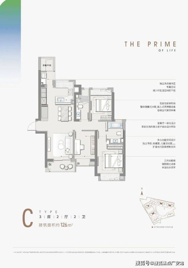 C户型:8栋楼中间套背靠背的户型,三开间朝南中规中矩,面宽略小于市场主流的三房户型。优点是户型相对方正浪费空间少,全明户型,且南北通透。