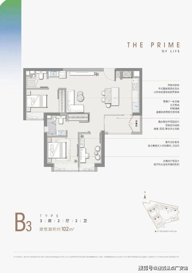 B3户型:8栋楼的中间套,整个小区唯一非南北通户型,落后于当下的主流设计。面积为市面上多见的100平三房户型,次卧卫生间是暗卫,客餐厅的LDK一体化设计比较出彩。