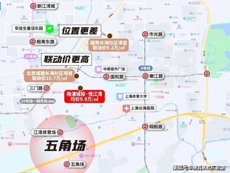 而杨浦城投悦江湾作为五角场商圈有且仅有的新房,联动价仅约9.9万/㎡,差异性和性价比显而易见。