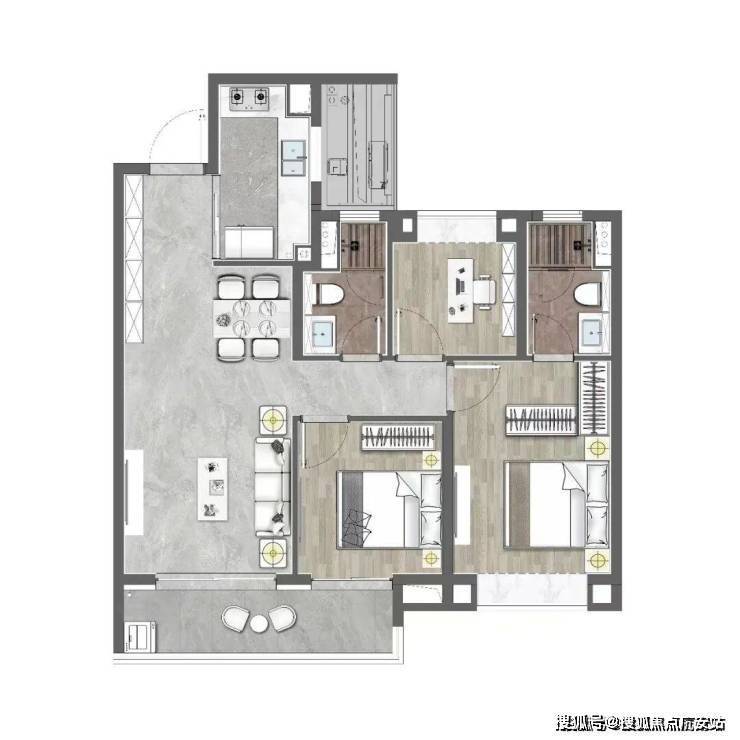 建面约99㎡3室2厅2卫户型,主要位于1、2号楼,1梯2户设计,做到了三开间朝南+双阳台设计+动静分离+主卧套房设计,功能性和尺度感完美结合。