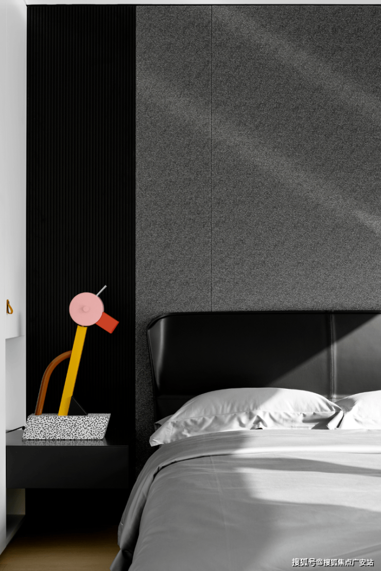 私密场域依旧保持静谧,黑白色基础上搭配了更多的色彩,例如深棕、浅紫等,艺术品的衬托深邃迷人,热络了家的氛围。