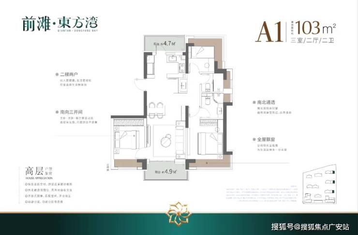 户型建筑层高3.1-3.15米,无连廊,双阳台配置。其中建面约103平户型2梯2户,其余一梯一户。
