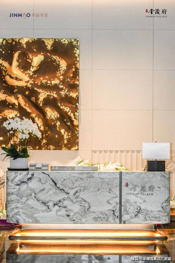 门头的接待台,选用 意大利芬迪白奢石 ,挂画灵感取自汉字“兰”的形意,尽显尊贵的同时也呼应金茂府业主精致圈层。