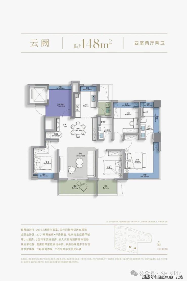 三阳台分区功能:创新三阳台设计,各司其职,解决生活痛点,提升品质。270 度无柱景观飘窗(边套专属):大幅拓展空间与视野,采光通透感拉满。一梯一户配置:私享阳光梯厅,增加隐形使用面积,兼具收纳、私密性与仪式感,给予豪宅级居住体验。