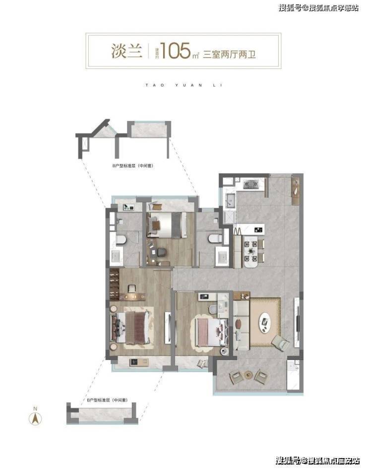 户型设计方面,105㎡样板间打造标准的三开间朝南设计,加之约3.1米的层高配置,整体居住体验明亮开阔。