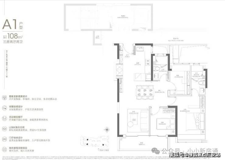 首先是进门即映入眼帘的LDBK一体化设计,搭配X灵动空间以及巨型宽面阳台,奢阔尺度非常出众;主卧约270°的转角飘窗,视野和采光全部拉满。