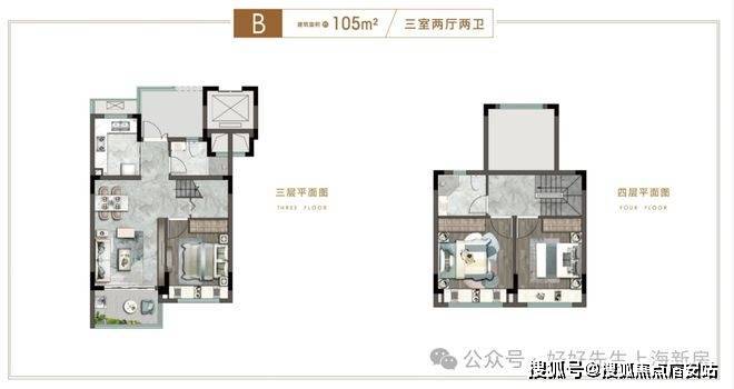 约123平上叠3房户型,共上下两层,全明设计,格局开阔,宽景阳台,上承天空,下承生活。