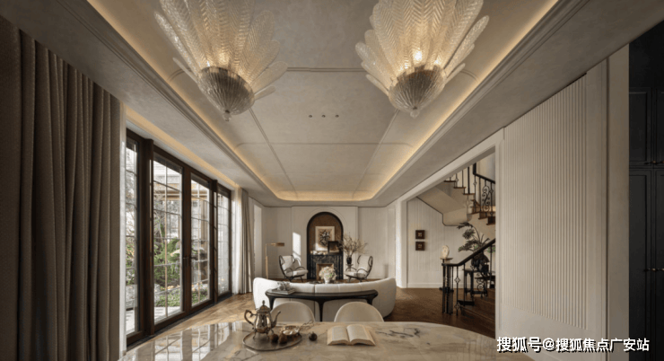 风貌别墅因历史形态限制,采光常受局限。保利·外滩序突破市面上风貌别墅的面宽局限,餐客厅约9.4米面宽,开阔的采光面搭配大面积玻璃窗,还能将室外的花园景致更好地引入室内,实现室内外景观的无界互通。