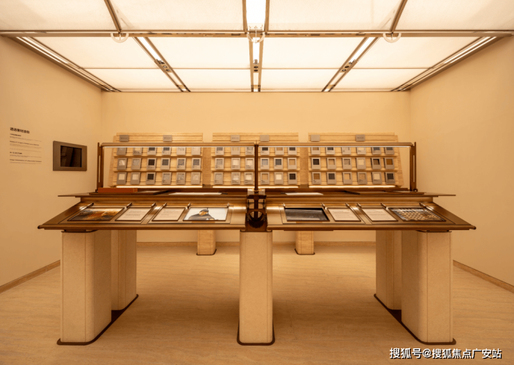皇家白奢石、Prada绿皮革面奢石、砖纹定制铝板... 细节中透露出精致与考究。工艺工法间对72种奢材的展示,让人心悦诚服。