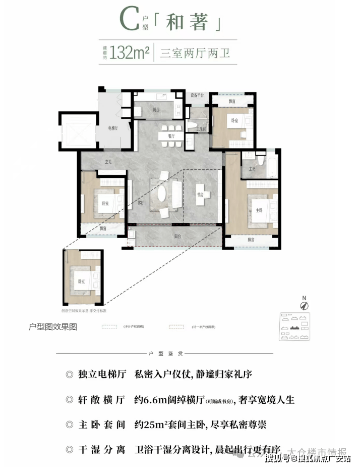 太仓高新区全新品质住宅楼盘【锦上和风云庭】,项目位于四通北路与凤莲路交叉口。实景示范区、样板间近日已经正式亮相。楼市情报员现场看过之后,在此给大家介绍建面约132㎡的三房两厅两卫大平层户型。我们一起看看,这个让参观者频频称赞的户型,到底有什么魅力。